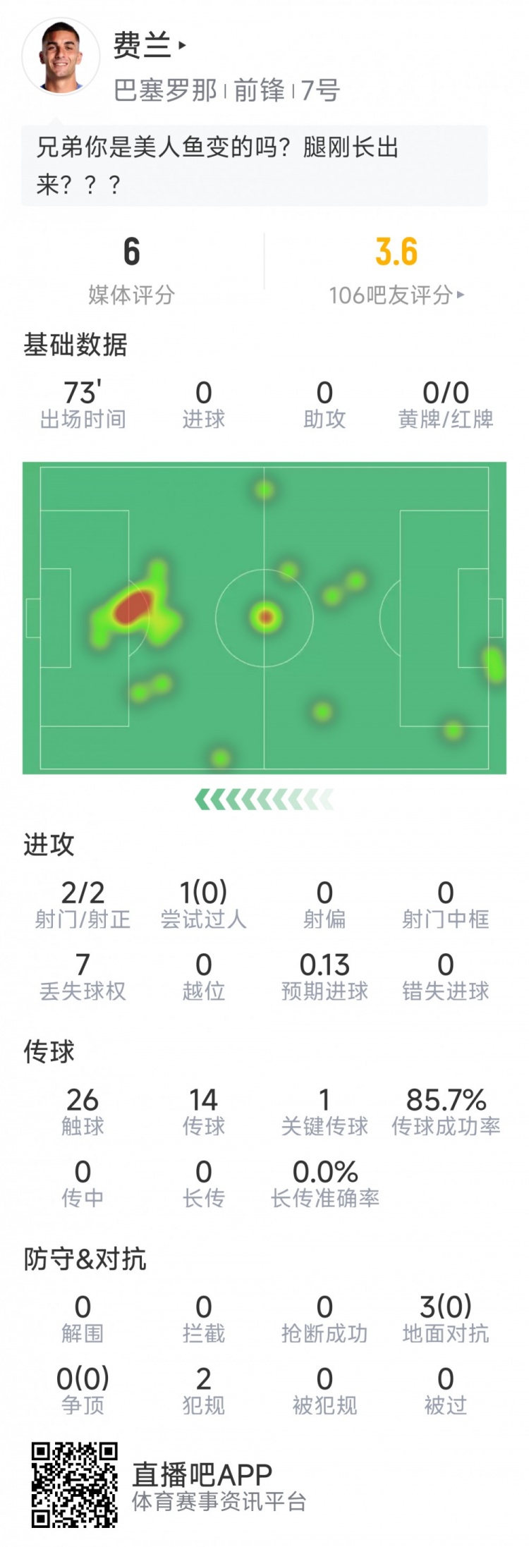 10月27日讯 本轮西甲国家德比正在进行,欧洲杯直播以下为费兰本场数据: