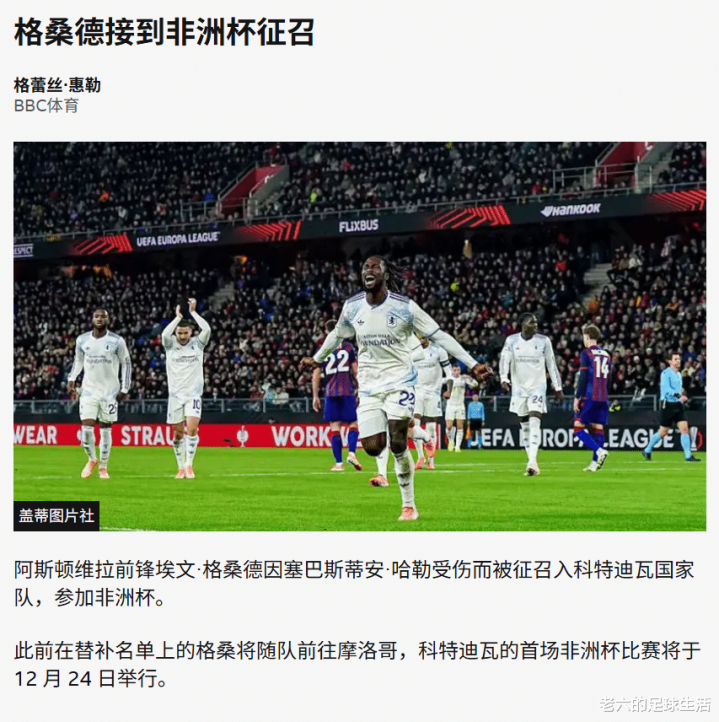 非洲杯本来对球队是没有影响的,整个英超只有6家俱乐部没有球员流失,但由于科特迪瓦的锋线哈勒负伤 ,他们临时征召了阿斯顿维拉的格桑德。