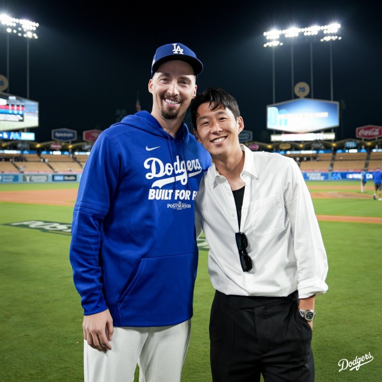 孙兴慜现场观看了洛杉矶道奇对阵辛辛那提红人的MLB外卡赛首战,道奇以10-5取胜,欧洲杯直播吧孙兴慜与道奇投手斯内尔合影。