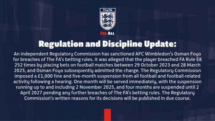 独立监管委员会已对AFC温网球员奥斯曼-福约违反博彩条例的行为作出处罚。据指控,该球员在2023年10月29日至2025年3月28日期间对古代足球 赛事 进行投注,违反英足总E8条例252次。