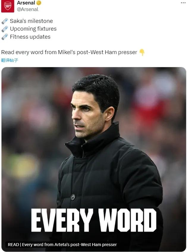 阿尔特塔出席了赛后新闻发布会,我们来看阿森纳主帅的发言。