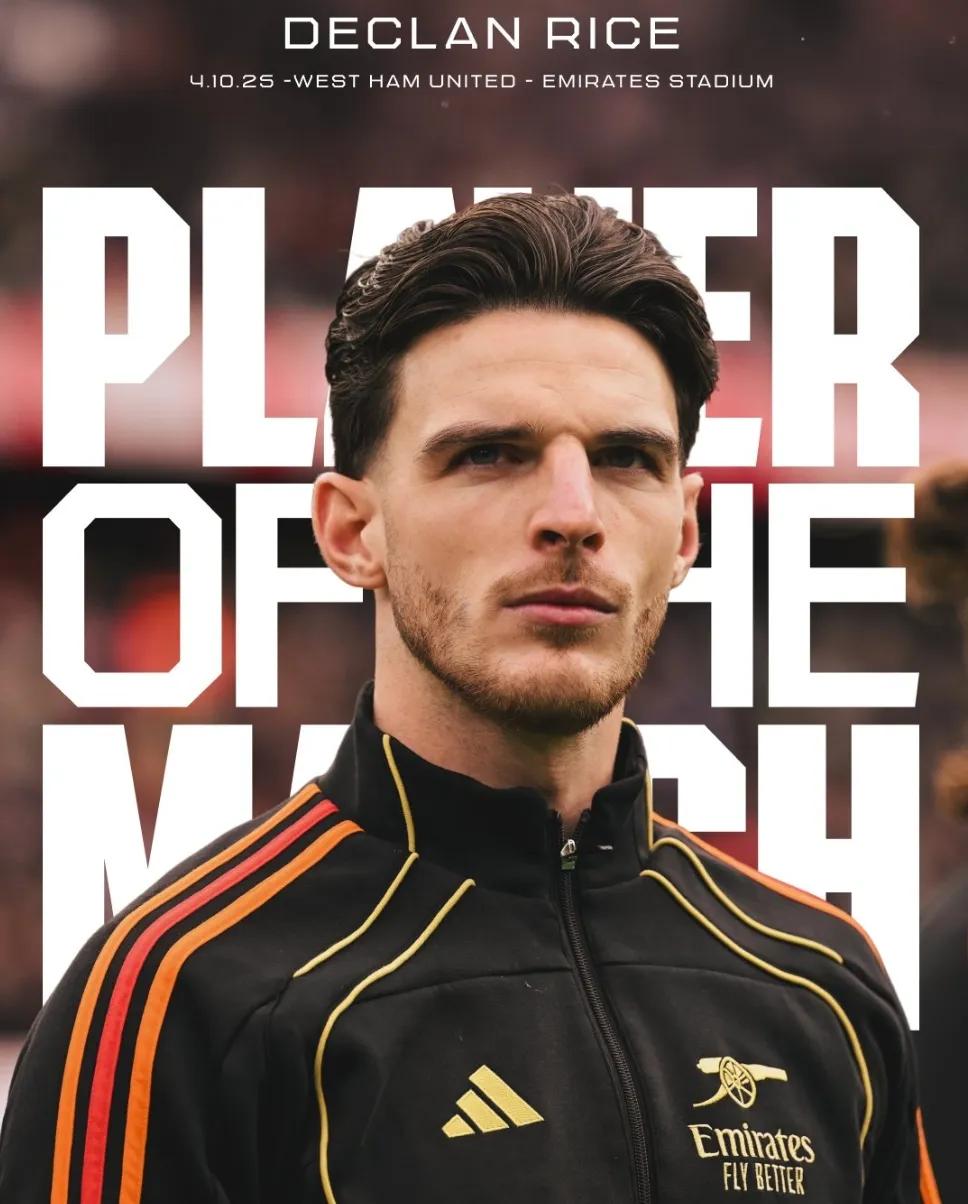 官方:赖斯被阿森纳官方票选为了全场赛事 最佳球员。