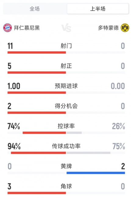 上半场,多特0脚打门,免费欧洲杯直播拜仁11射5正。预期得分 数拜仁0.78领跑 多特,盘带时间 拜仁74%领跑 多特26%。