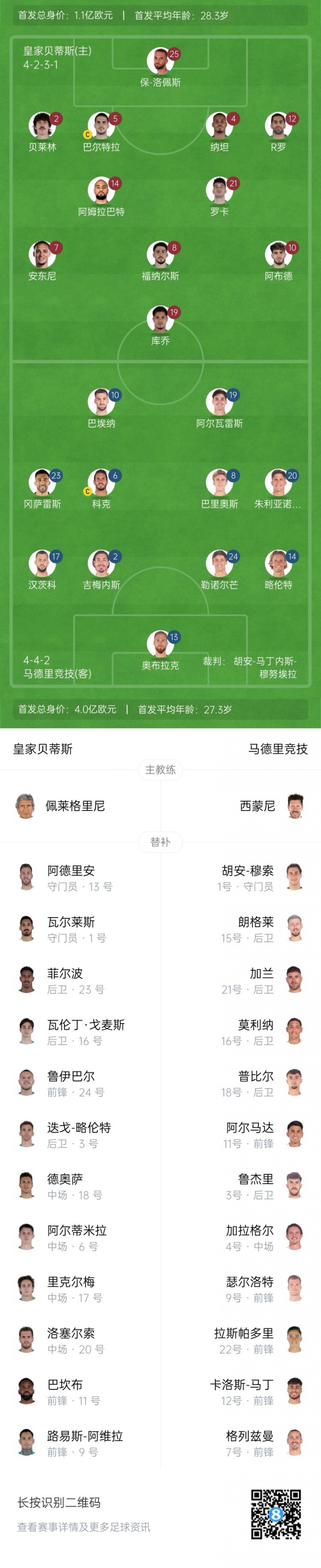 马德里竞赛 后备 :1-穆索、3-鲁杰里、15-朗格莱、16-莫利纳、18-普比尔、21-加兰、4-加拉格尔、11-阿尔马达、7-格列兹曼、9-瑟洛特、12-卡洛斯-马丁、22-拉斯帕多里