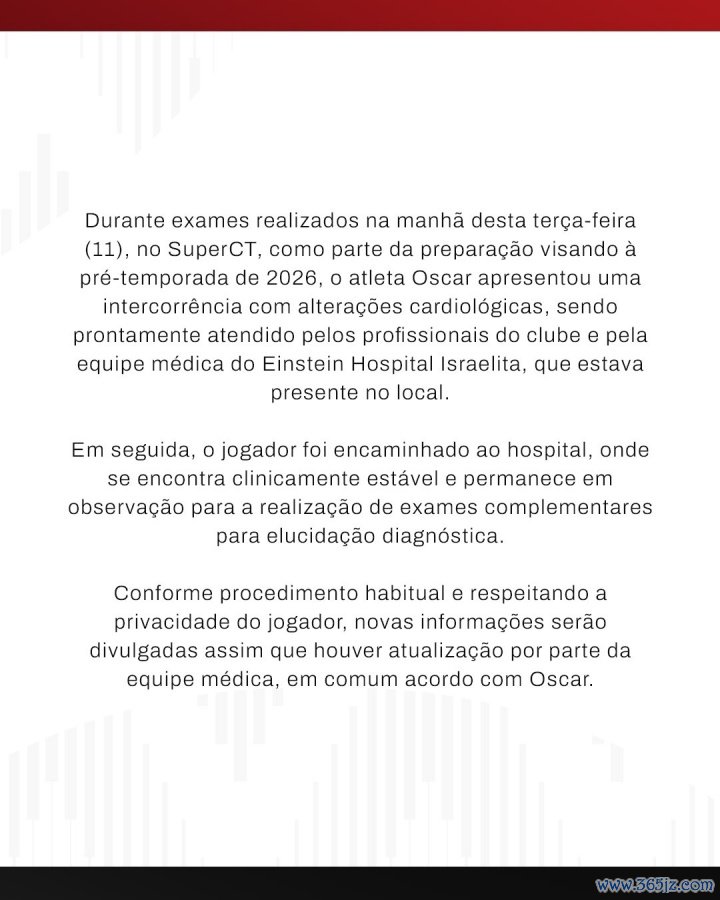作为准备比赛 2026 年季前赛的一部分,在本周二(11日)上午于 SuperCT 进行的检查中,运动活动 员奥斯卡出现心脏异常情况,随即由俱乐部专业人员及现场的以色列埃因斯坦医院医疗队伍 紧急救治。随后,足球直播无插件免费在线观看球员被转送至医院,目前临床情况稳定,并留院观察以进行进一步检查明确诊断。按照惯例并尊重球员隐私,后续信息将在医疗队伍 与奥斯卡共同同意后及时更新。