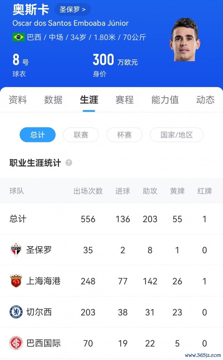 34岁的奥斯卡职业生涯曾效力巴西国际、切尔西、上海海港、圣保罗,上赛季中超结束后他自由身回到巴西,加盟圣保罗。